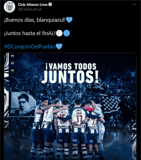 En su cuenta de Twitter, Alianza Lima propuso una gráfica especial con un mensaje emotivo: “¡Buenos días, blanquiazul! ¡Juntos hasta el finAL!”. Y esto, generó en el hincha, una alegría incomparable, haciéndose automáticamente un hecho viral.