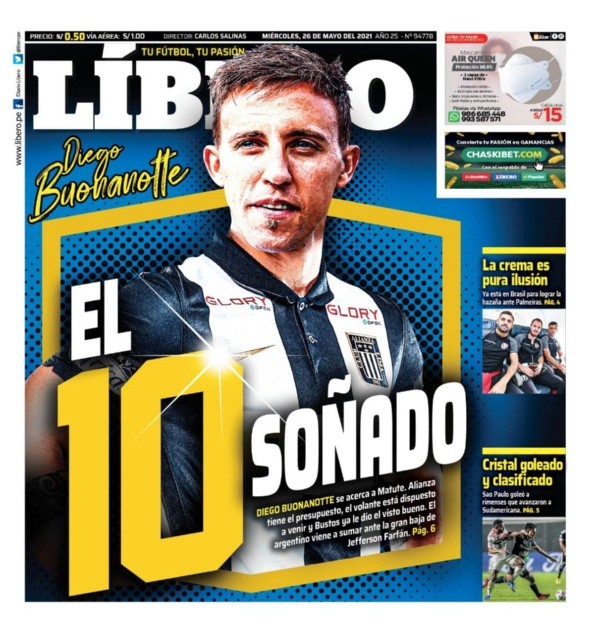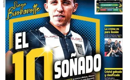 “El 10 soñado”, titularon hoy en su portada. “Diego Buonanotte se acerca a Matute. Alianza tiene el presupuesto, el volante está dispuesto a venir y Bustos ya le dio el visto bueno. El argentino viene a sumar ante la gran baja de Jefferson Farfán“, detallan junto a la imagen del jugador con la camiseta.