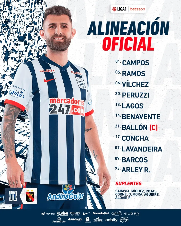 El club ‘blanquiazul’ compartió hace unos instantes la alineación confirmada que usará el ‘Chicho’ Salas ante los arequipeños:Ángelo Campos, Christian Ramos, Yordi Vílchez, Gino Peruzzi, Ricardo Lagos, Josepmir Ballón, Jairo Concha, Arley Rodríguez, Cristian Benavente, Pablo Lavandeira y Hernán Barcos.