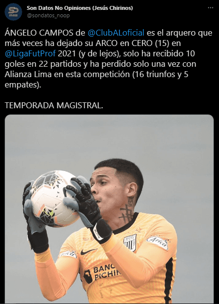 “Ángelo Campos de Alianza Lima es el arquero que más veces ha dejado su arco en cero (15) en “Liga 1″ 2021 (y de lejos), solo ha recibido 10 goles en 22 partidos y ha perdido solo una vez con Alianza Lima en esta competición (16 triunfos y 5 empates). TEMPORADA MAGISTRAL”.