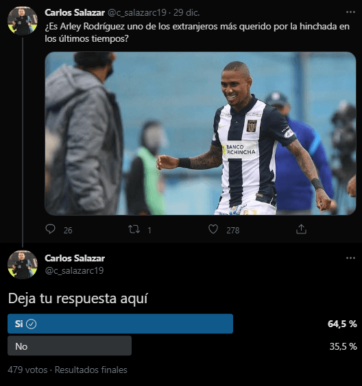“¿Es Arley Rodríguez uno de los extranjeros más queridos por la hinchada en los últimos tiempos?”. Comentó en su cuenta Carlos Salazar. Y sus seguidores automáticamente dieron su opinión, fueron más los que aprobaron esta consulta. Pero los que estaban en contra, aun así destacaron al querido Arley. Hace bien su chamba el muchacho.