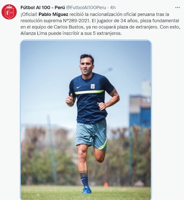 En Alianza Lima se encuentran festejando, y es que el jugador Pablo Míguez recibió la nacionalidad peruana mediante una Resolución Suprema donde se encuentra la firma del presidente del Perú, Pedro Castillo, y el Ministro del Interior, Avelino Trifón. El futbolista, quien se desempeña en varias posiciones del campo, ya no ocupará una plaza de extranjero en el conjunto del estratega argentino Carlos Bustos.
