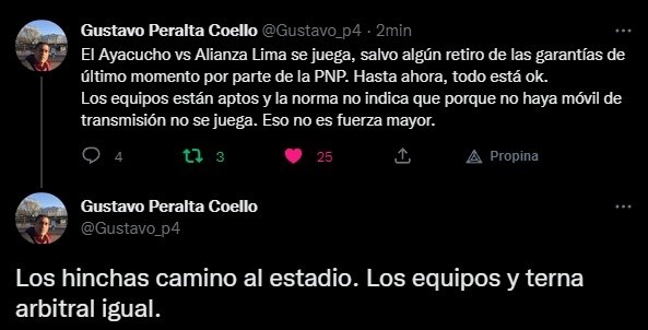 El detalle más claro nos lo presenta Gustavo Peralta, del ‘Diario Líbero’, que explica cómo se está moviendo la logística para este duelo: “El Ayacucho vs Alianza Lima se juega, salvo algún retiro de las garantías de último momento por parte de la PNP. Hasta ahora, todo está ok. Los equipos están aptos y la norma no indica que porque no haya móvil de transmisión no se juega. Eso no es fuerza mayor”.