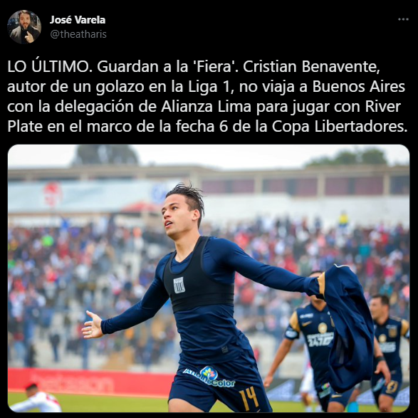 “LO ÚLTIMO. Guardan a la ‘Fiera’. Cristian Benavente, autor de un golazo en la Liga 1, no viaja a Buenos Aires con la delegación de Alianza Lima para jugar con River Plate en el marco de la fecha 6 de la Copa Libertadores”. Publicó el comunicador social, generando comentarios diversos.