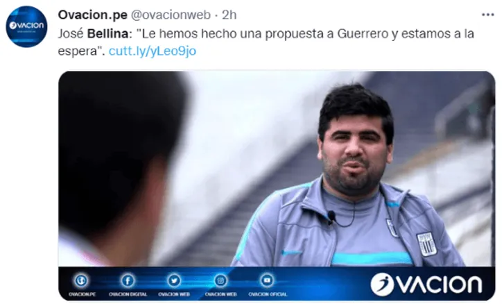 José Bellina, gerente deportivo de Alianza Lima, habló de la propuesta hecha a Paolo Guerrero, y la posibilidad de que llegue a La Victoria para reforzar el plantel de Carlos Bustos en el Torneo Clausura de la Liga 1. Asimismo, se refirió a la situación de Jefferson Farfán tras las últimas declaracionesdel doctor Hugo Blácido.