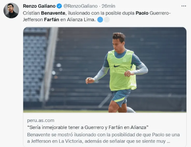 “Sería un sueño para cualquier aliancista y para cualquier aficionado al fútbol peruano. Farfán y Guerrero han sido dos referentes en la selección por muchos años y si los podemos tener juntos en Alianza Lima sería algo inmejorable para nosotros”, comentó Benavente trasser consultado sobre lo que significaría jugar con la ‘Foquita’ y el ‘Depredador’.
