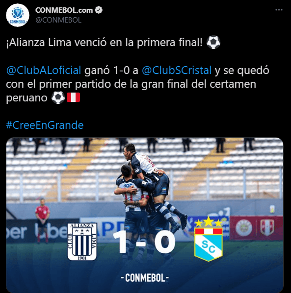 “¡Alianza Lima venció en la primera final! Alianza Lima ganó 1-0 a Sporting Cristal y se quedó con el primer partido de la gran final del certamen peruano. #CreeEnGrande”. Despertando los comentarios de muchos seguidores del deporte rey a nivel continental. Felicitando la cobertura hecha.