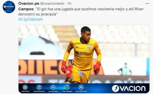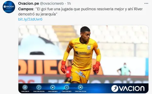 Alianza Lima no pudo imponer su localía y cayó derrotado por 1-0 anteRiver Plateen su debut del Grupo F de laConmebol Libertadores 2022, duelo que se disputó en el Estadio Nacional de Lima. En ese sentido,Ángelo Campos, portero ‘blanquiazul’, dio sus impresiones de lo que les dejó el partido en el que le plantaron frente al ‘Millonario’, pero que en una desconcentración, el equipo de Marcelo Gallardo definió el partido.