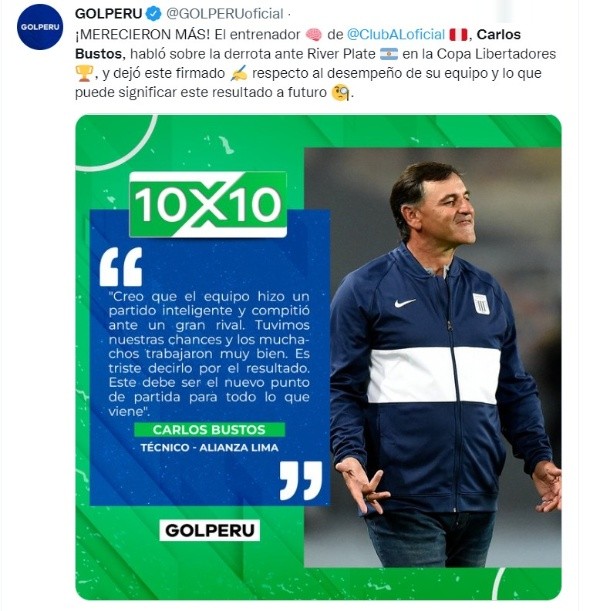 Finalmente, Carlos Bustos habló sobre las chances que tuvieron los ‘Blanquiazules’, sin dejar de lado mérito de los visitantes tras llevarse los tres puntos: “Pudo haber empatado, pudo haber sido otro el resultado”, dijo sobre sus dirigidos. Y añadió por parte de River Plate: “Es un equipo de mucha jerarquía y a veces en algunas situaciones que uno puede estar un poco desconcentrado puede llegar el gol”.