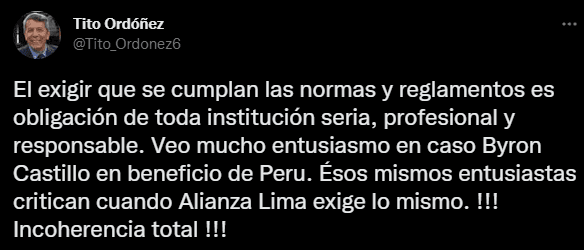 Lo que menciona el vocero, es lo siguiente: “El exigir que se cumplan las normas y reglamentos es obligación de toda institución seria, profesional y responsable. Veo mucho entusiasmo en caso Byron Castillo en beneficio de Perú. Esos mismos entusiastas critican cuando Alianza Lima exige lo mismo ¡¡¡Incoherencia total!!!”. En clara alusión a quienes malinterpretan las acciones del ‘equipo del pueblo’.