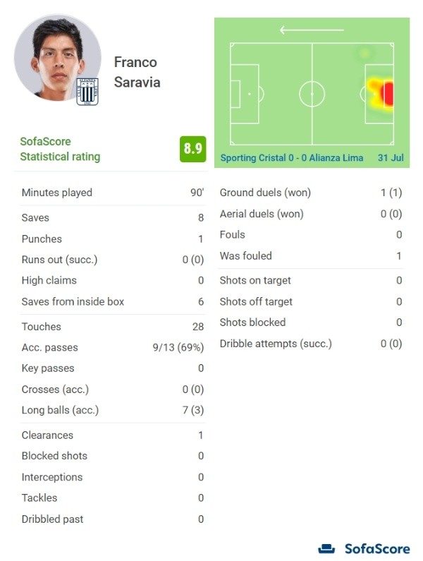 Con el respaldo de los números, la página SofaScore le dio un altísimo puntaje. Entendiendo que el máximo es 10, Franco Saravia recibió un contundente 8.9 puntos de evaluación. Teniendo 8 salvadas y una providencial, la página también toma en consideración al rival: Sporting Cristal.