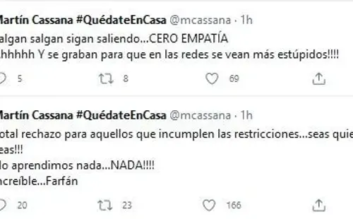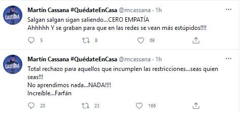 “Total rechazo para aquellos que incumplen las restricciones…seas quien seas!!! No aprendimos nada…NADA!!!! Increíble…Farfán”, escribió para comenzar el también conductor. “Salgan salgan sigan saliendo...CERO EMPATÍA Ahhhhh Y se graban para que en las redes se vean más estúpidos!!!!”, complementó en otro comentario.
