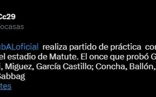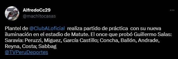 “Plantel de Alianza Lima realiza partido de práctica con su nueva iluminación en el estadio de Matute. El once que probó Guillermo Salas: Saravia: Peruzzi, Miguez, García Castillo; Concha, Ballón, Andrade, Reyna, Costa; Sabbag”. Si nos damos cuenta, hay algunas caras nuevas, cada hincha podrá sacar su conclusión final. Hernan Barcos ya no es tan titular.