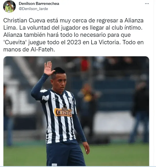 “Christian Cueva está muy cerca de regresar a Alianza Lima. La voluntad del jugador es llegar al club íntimo. Alianza también hará todo lo necesario para que Cuevita juegue todo el 2023 en La Victoria. Todo en manos de Al-Fateh”, publicó el comunciador.