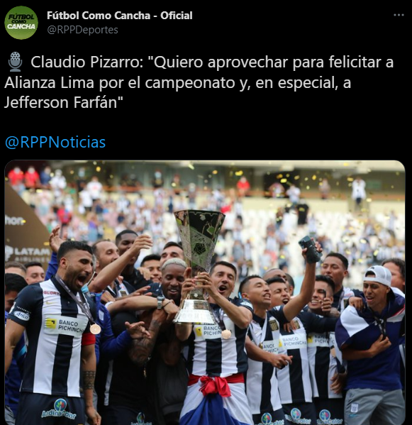 Destacando a la institución de la cual es hincha, por el reciente título nacional ante Sporting Cristal. Y de pasada, un cariño para su principal referente, Jefferson Farfán. Con quien compartió varios años los camerinos de la Selección Peruana, siendo personas muy cercanas.
