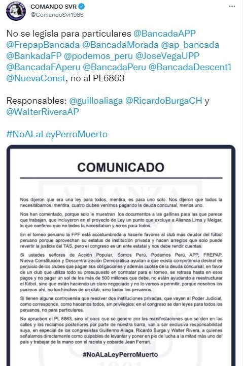 “No aprueben el PL 6863, sino el caos que se genere por las manifestaciones que se den en las calles y reclamos de nuestra barra será responsabilidad suya, en especial los congresistas Guillermo Aliaga, Ricardo Burga y Walter Rivera…”.