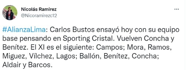 Alianza Lima se viene preparando para enfrentar a Sporting Cristal en la fecha 5 de la Liga 1. El partido se jugará este domingo 6 de marzo a las 3:30 pm en el estadio Alejandro Villanueva. Los dirigidos por Carlos Bustos necesitan ganar los tres puntos para seguir sumando en la tabla de posiciones y acercarse a los primeros puestos del torneo, pues en la jornada 4 no pudieron con Alianza Atlético en el calor de Sullana cayendo por 4-2.