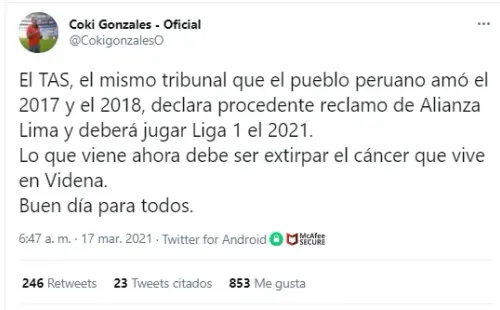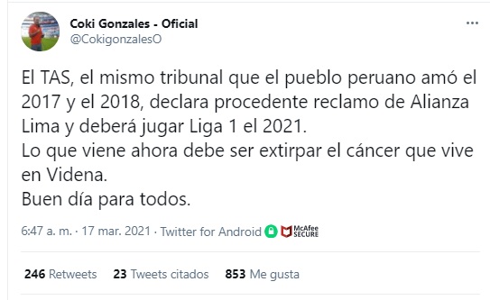 Coki Gonzales, por esto esto, escribió lo seguiente en twitter: “El TAS, el mismo tribunal que el pueblo peruano amó el 2017 y el 2018, declara procedente reclamo de Alianza Lima y deberá jugar Liga 1 el 2021. Lo que viene ahora debe ser extirpar el cáncer que vive en Videna. Buen día para todos”.