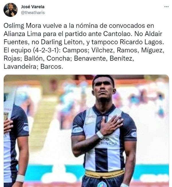 Alianza Lima ya tendría el once para enfrentar al ‘Delfín’ y como dice una frase en el fútbol “equipo que gana no se cambia”, así que de esta forma arrancarían los ‘Íntimos’ el compromiso: Ángelo Campos, Yordi Vílchez, Christian Ramos, Pablo Míguez, Fabio Rojas; Jairo Concha, Josepmir Ballón, Cristian Benavente, Pablo Lavandeira, Edgar Benítez; Hernán Barcos.
