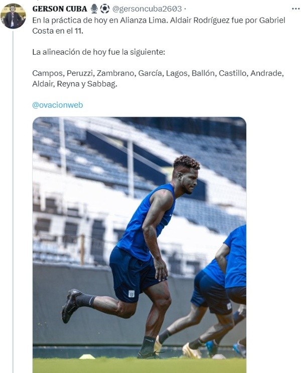Según la información que comparte vía Twitter Gerson Cuba, el periodista brindó la alineación con la que trabajó Alianza Lima este martes 18 de abril. Colocando al delantero Aldair Rodríguez como extremo derecho, la noticia también impacta directamente en Gabriel Costa y Franco Zanelatto.