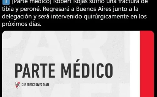 Horas después, cuando se confirmaron los hechos, y se dijo mucho al respecto. River Plate lanzó un comunicado en sus redes sociales: “[Parte médico] Robert Rojas sufrió una fractura de tibia y peroné. Regresará a Buenos Aires junto a la delegación y será intervenido quirúrgicamente en los próximos días”.