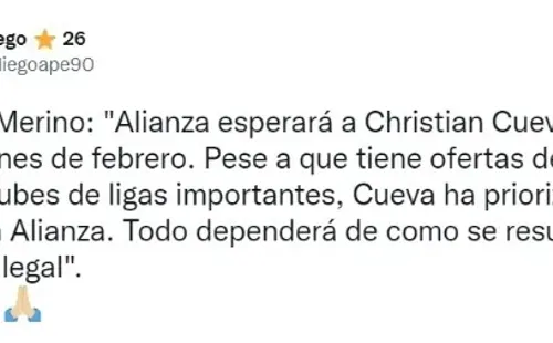 “En Alianza Lima esperarán hasta fines de febrero a Christian Cueva”, adelantó Milena Merino en el programa Tiempo Extra de GOLPERU. Siendo conscientes que esta información parte también por el actual estado contractual del mediocampista, está en un lío legal con Santos de Brasil, la noticia es trascendental.