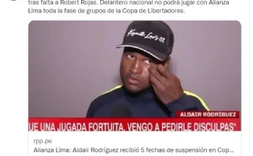 A través de sus redes sociales, el periodista Kevin Pacheco anunció que la decisión era tajante: “Aldair Rodríguez fue suspendido por Conmebol con 5 fechas de sanción tras falta a Robert Rojas. Delantero nacional no podrá jugar con Alianza Lima toda la fase de grupos de la Copa de Libertadores“, publicó el periodista.
