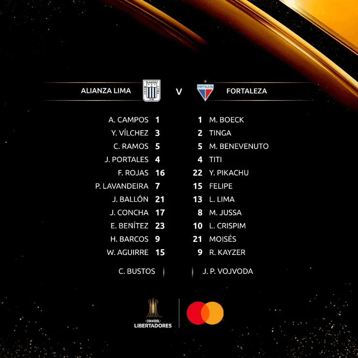 Por su parte, Fortaleza alineará con: Boeck, Tinga, Benevenuto, Titi, Pikachu, Felipe, Lima, Jussa, Crispim, Moisés y Kayzer.