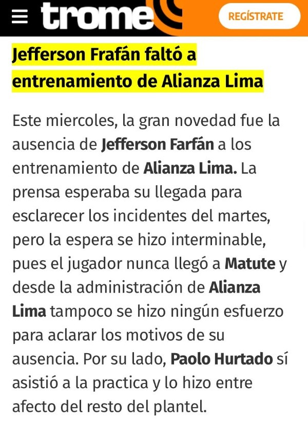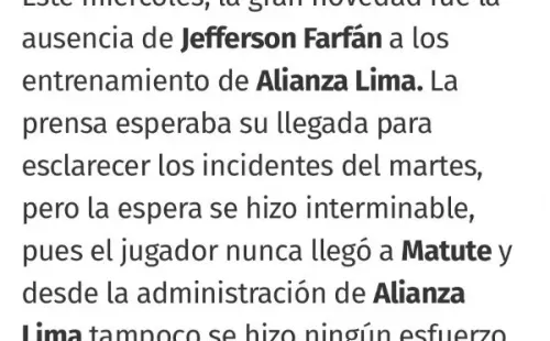 Viviéndose una gran tensión en Alianza Lima, Jefferson Farfán se ausentó de los entrenamientos de este miércoles 13 de julio. No presentándose en las instalaciones del reciento deportivo Matute el que sí llegó fue Paolo Hurtado.