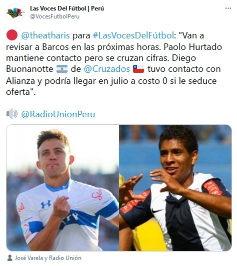 José Varela de Líbero detalló la situación: “Paolo Hurtado mantiene contacto pero se cruzan cifras. Diego Buonanotte tuvo contacto con Alianza y podría llegar en julio a costo 0 si le seduce oferta”. La cuenta Alianza History confirmó lo último: “Admitió que han tenido unos diálogos y unas comunicaciones”.