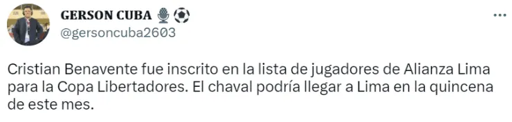 “Cristian Benavente fue inscrito en la lista de jugadores de Alianza Lima para la Copa Libertadores. El chaval podría llegar a Lima en la quincena de este mes”, escribió el comunicador en su cuenta de twitter.