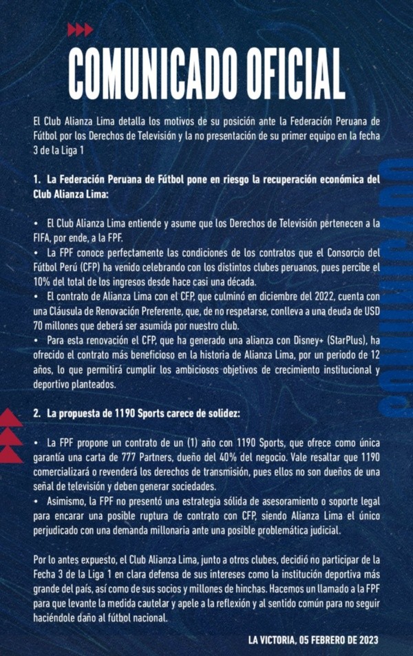 Por lo antes expuesto, el Club Alianza Lima, junto a otros clubes, decidió no participar de la fecha 3 de la Liga 1 en clara defensa de sus intereses como la institución deportiva más grande del país, así como de sus socios y millones de hinchas. Hacemos un llamado a la FPF para que levante la medida cautelar y apele a la reflexión y al sentido común para no seguir haciéndole daño al fútbol nacional.