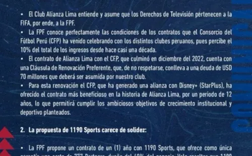 COMUNICADO DE ALIANZA LIMA SOBRE LOS DERECHOS DE TELEVISIÓN: