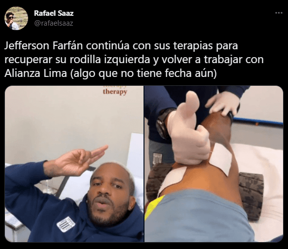 Revisando un poco las redes sociales, encontramos una información del periodista deportivo, Rafael Saaz, quien pone en contexto la actualidad del ’10 de la calle’: “Jefferson Farfán continúa con sus terapias para recuperar su rodilla izquierda y volver a trabajar con Alianza Lima (algo que no tiene fecha aún)”.