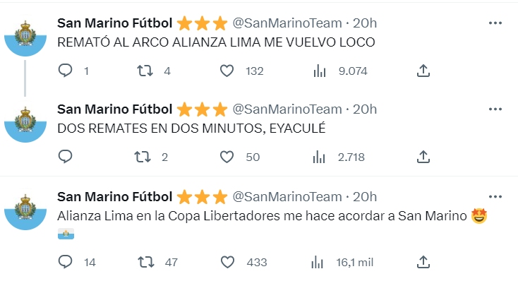 Popular por genera parodia a raíz de los encuentros de la Selección de San Marino, una cuenta de Twitter ha tomado fuerza. Mostrándose hilarante cada vez que pierde algún club importa o tiene una racha negativa, ahí entra en acción la sarcástica burla y ahora la víctima es Alianza Lima.