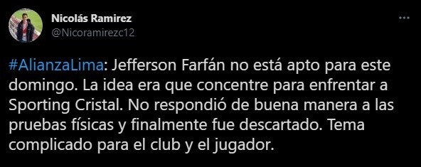 “Jefferson Farfán no está apto para este domingo. La idea era que concentre para enfrentar a Sporting Cristal. No respondió de buena manera a las pruebas físicas y finalmente fue descartado. Tema complicado para el club y el jugador”. Comentó el comunicador social, y despertó la preocupación general.