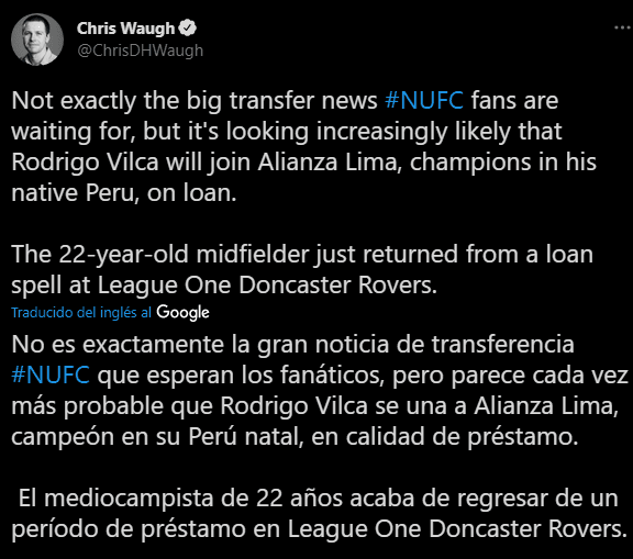 “No es exactamente la gran noticia de transferencia #NUFC que esperan los fanáticos, pero parece cada vez más probable que Rodrigo Vilca se una a Alianza Lima, campeón en su Perú natal, en calidad de préstamo. El mediocampista de 22 años acaba de regresar de un período de préstamo en League One Doncaster Rovers”. Mencionó, dándole más fuerza a todos los trascendidos anteriores. Quizás esta sea la información definitiva. Veremos.
