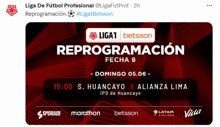 La Liga 1informó este jueves sobre la reprogramación del duelo entre Sport Huancayo y Alianza Lima, el cual se jugará el próximo 5 de junio, en fecha FIFA, por lo que ambas escuadras no podráncontar con los futbolistas convocados a la ‘blanquirroja’, en caso alguno de ellos sea citado para el duelo amistoso ante Nueva Zelanda y el repechaje intercontinental ante Australia/Emiratos Árabes.