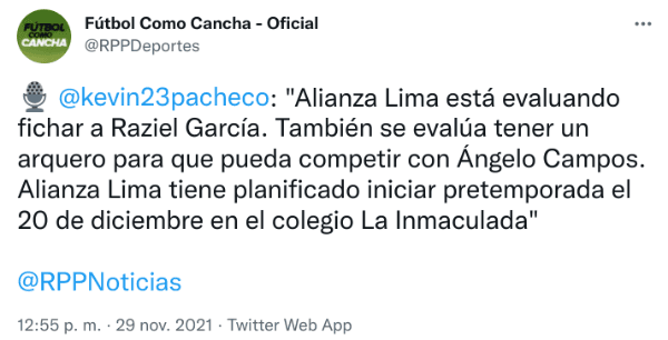 Este lunes, Kevin Pacheco de RPP, además de confirmar la cercanía de lo de Raziel García, señaló lo siguiente: “Se evalúa tener un arquero para que pueda competir con Ángelo Campos. Alianza Lima tiene planificado iniciar pretemporada el 20 de diciembre en el colegio La Inmaculada”. Ahora, habrá que esperar.