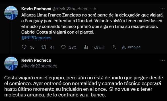 El periodista de RPP Noticias, Kevin Pacheco, contó eso al comienzo: “Alianza Lima: Franco Zanelatto no será parte de la delegación que viajará a Paraguay para enfrentar a Libertad. Volante volvió a tener molestias en el muslo y comando técnico prefirió que siga en Lima su recuperación. Gabriel Costa si viajará con el plantel”.