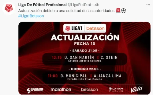 LaLiga 1informó este jueves sobre la reprogramación del duelo por la fecha 15 de la Liga 1 entre Deportivo MunicipalyAlianza Lima, el cual se jugará el domingo 22 de mayo a las 11:00 a.m. en el estadio de Villa el Salvador. Como se recuerda, este encuentro estaba pactado en un principio para jugarse en la tarde del21 de mayo.