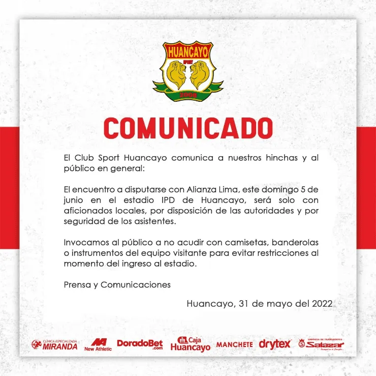 A través de un comunicado publicado en sus redes sociales, el club de la Incontrastable informó sobre la medida que se ha tomado para dicho encuentro. “El club Sport Huancayo comunica a nuestros hinchas y público en general que el encuentro a disputarse con Alianza Lima, este domingo 5 de junio en el estadio IPD de Huancayo, será solo con aficionados locales, por disposición de las autoridades y por seguridad de los asistentes.Invocamos al público a no acudir con camisetas, banderolas o instrumentos del equipo visitante para evitar restricciones al momento del ingreso al estadio”,