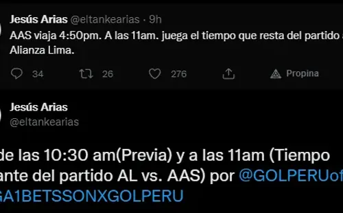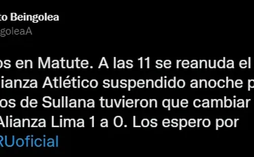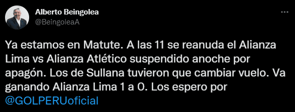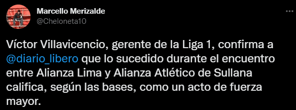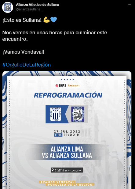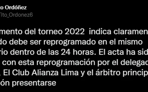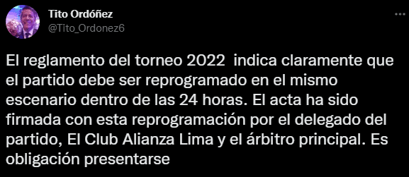 El vocero oficial de Alianza Lima, Tito Ordoñez, en su cuenta de Twitter comentó que el partido se deberá jugar de todas formas: “El reglamento del torneo 2022 indica claramente que el partido debe ser reprogramado en el mismo escenario dentro de las 24 horas. El acta ha sido firmada con esta reprogramación por el delegado del partido, El Club Alianza Lima y el árbitro principal. Es obligación presentarse”.