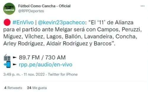 Tal como adelantó, Kevin Pacheco, periodista de RPP: “el ’11’ ‘blanquiazul’ para el partido ante Melgar será con Campos, Peruzzi, Míguez, Vílchez, Lagos, Ballón, Lavandeira, Concha, Arley Rodríguez, Aldair Rodríguez y Barcos”, indicó el reportero.