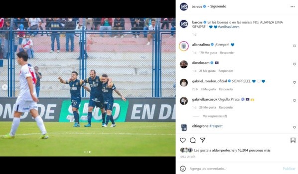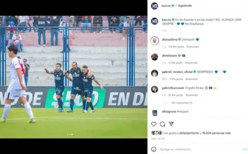 Hernán Barcos es muy conocido, aparte de su gran talento como futbolista y goleador, también por interactuar y publicar mucho en las redes sociales, donde el ‘Pírata’ deja ver mensajes como este: “¿En las buenas o en las malas? No, Alianza Lima siempre”, fue lo que puso el atacante argentino en su cuenta de Instagram, junto a una imagen celebrando el gol anotado en Villa El Salvador.