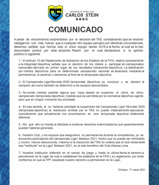 El ente internacional TAS falló a favor deAlianza Limay le redujo 2 puntos a Carlos Stein correspondientes de la Liga 1 2020. Luego que la FPF emitiera un comunicado que aceptará la decisión del TAS, el equipo de Lambayeque también emitió un comunicado.