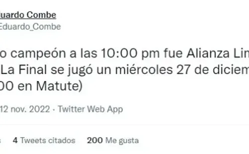 Es que según el periodista especializado en estadísticas, Eduardo Combe publicó en sus redes sociales que el último equipo peruano que salió campeón fue a las 10:00 p.m. fue Alianza Lima: