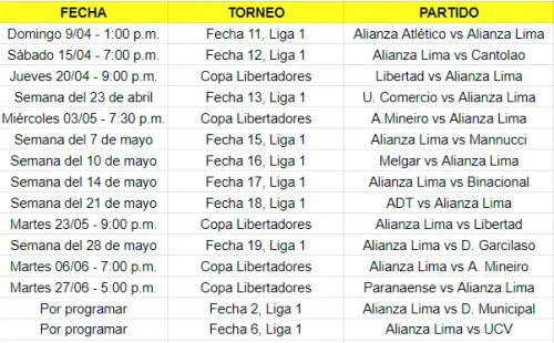 Alianza Lima es el bicampeón de la Liga 1, han invertido armando un Dream Team, con muchas de estrellas para lograr el tricampeonato y sobre todo destacar en la Copa Conmebol Libertadores de este año. Pero para conseguir estos objetivos, tendrán que pasar por un camino muy difícil, en el cual tendrán que afrontar 15 partidos en 12 semanas.