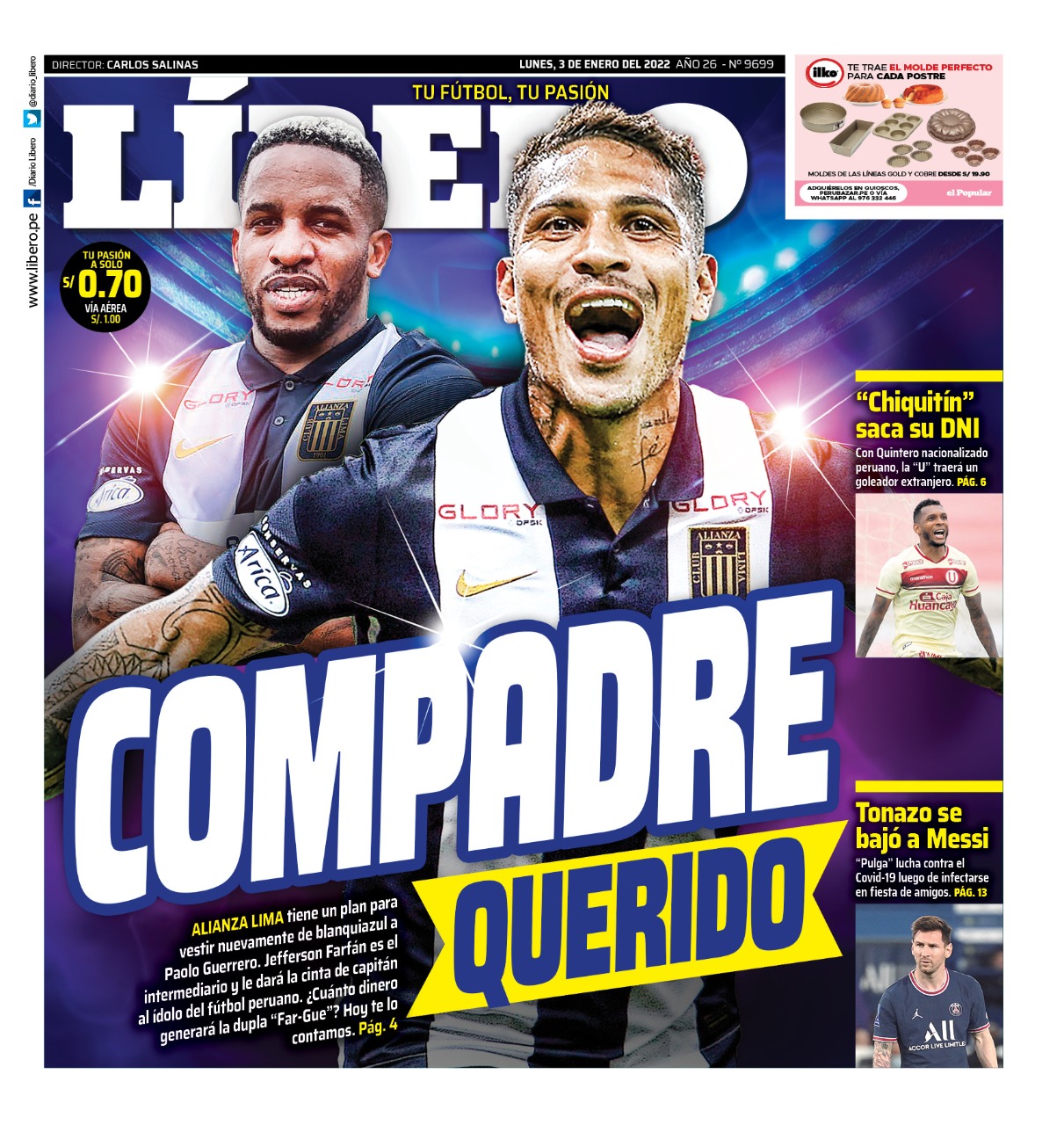 “Alianza Lima tiene un plan para vestir nuevamente de blanquiazul a Paolo Guerrero. Jefferson Farfán es el intermediario y le dará la cinta de capitán al ídolo del fútbol peruano. ¿Cuánto dinero ganará la dupla ‘Far-Gue’? Hoy te lo contamos”, manifestó el Diario Líbero en sus redes sociales acompañando la información con la portada de este lunes 3 de enero del 2022. ¿Lo logrará?