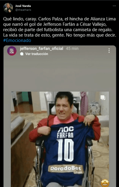 “Qué lindo, caray. Carlos Palza, el hincha de Alianza Lima que narró el gol de Jefferson Farfán a César Vallejo, recibió de parte del futbolista una camiseta de regalo. La vida se trata de esto, gente. No tengo más que decir”. Acompañado de la captura del Instagram personal del capitán aliancista.